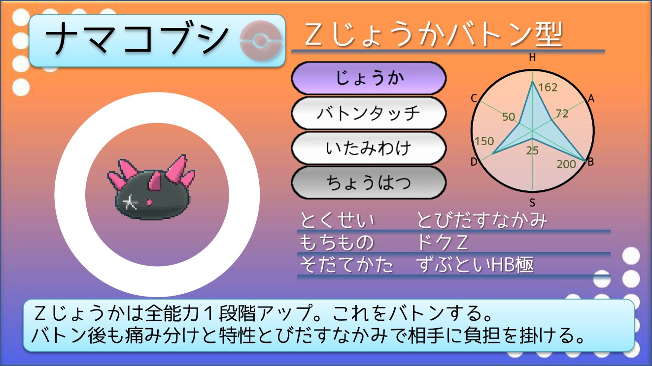 てつぼう ポケモンusum育成サンプル zじょうかバトンナマコブシ zじょうかは全能力1段階アップ バトン成功後も戦力になるよう 痛み分け とびだすなかみでちょうど相打ちを狙う T Co Cyvrnhqbbi Twitter